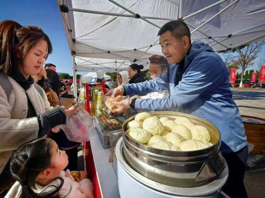赛场外的特色展位,同样热力四射。从昨天上午10点开始,鸳湖旅社的工作人员就开始忙碌起来,他们带来了热气腾腾的鸳湖大包。“两个比赛日,我们一直在补货。仅揭幕战一天,我们就卖了近2000单。”另一边,体育彩票摊位前,也挤满了来加持运气的球迷。