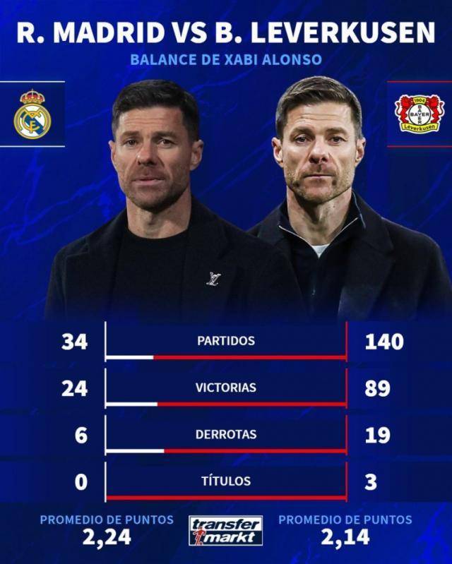皇马主帅阿隆索下课,德国转会市场列出阿隆索执教勒沃库森、皇马的数据,并作出对比。