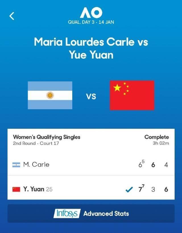 2026年澳网女单资格赛第二轮,袁悦鏖战三小时2分钟以7比6(5)、3比6、6比4艰难战胜卡莱,晋级资格赛决胜轮。决胜轮中,她将与齐丹谢克争夺正赛门票。