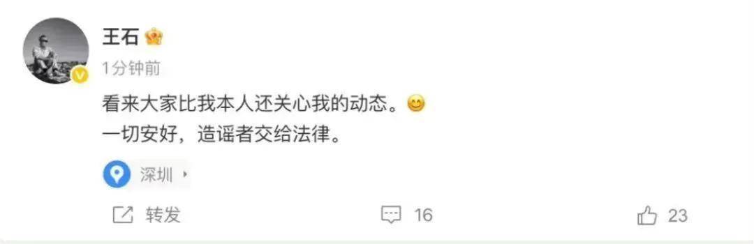 王石随后亦回应称:“看来大家比我本人还关心我的动态。一切安好,造谣者交给法律。”