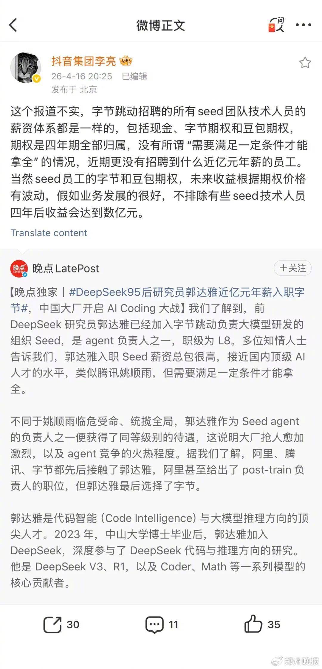 有传言称,前DeepSeek研究员郭达雅已被字节跳动以亿元年薪“挖角”。抖音副总裁李亮回应:不实!详述seed员工薪资体系,“不排除有人4年后收益可达数亿元”。