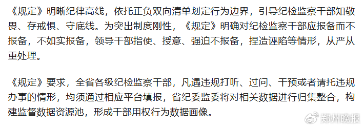 近日,省纪委监委制定印发《河南省纪检监察干部违规打听、过问、干预监督执纪执法、巡视巡察工作和请托违规办事的报备及责任追究规定》,以严的制度、实的举措持续加力内部监督。