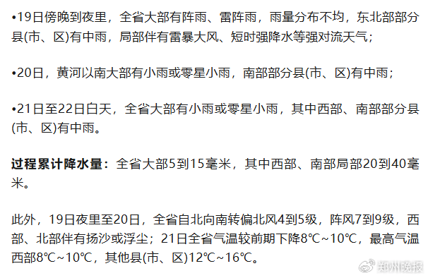 受较强冷空气影响,省气象台预计,4月19日傍晚至22日,河南有一次降水降温天气过程。根据预报↓