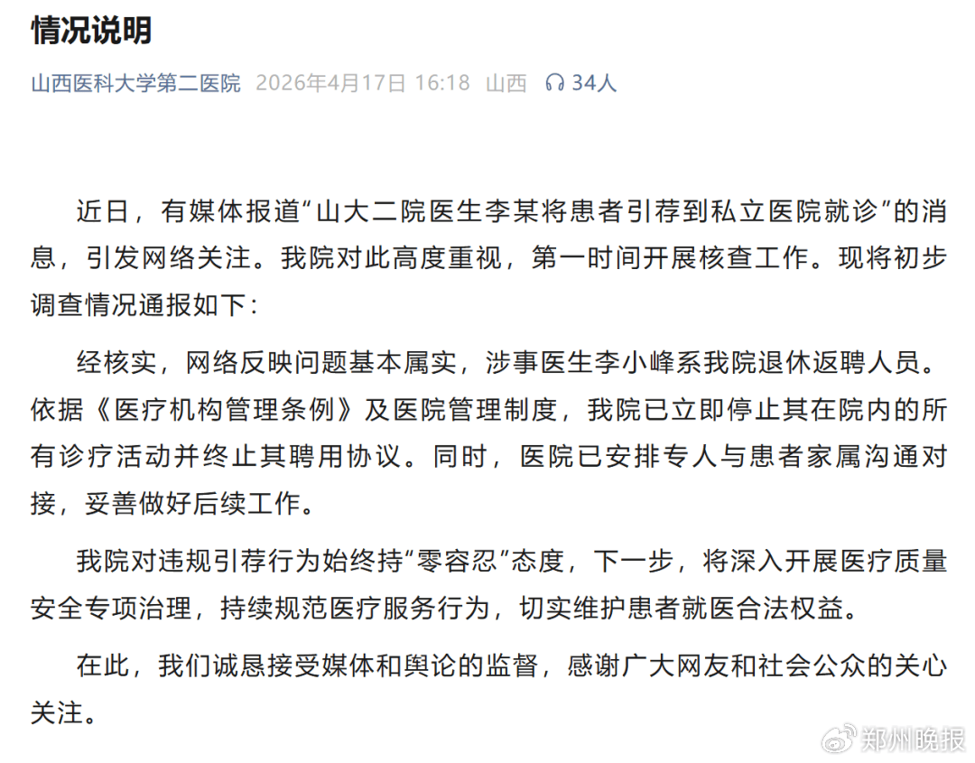 公立三甲医院挂号,医生将患者引荐到私立医院就诊,患者检查后不久离世。4月17日,山西医科大学第二医院通报:基本属实,涉事医生系退休返聘人员,已停止聘用。